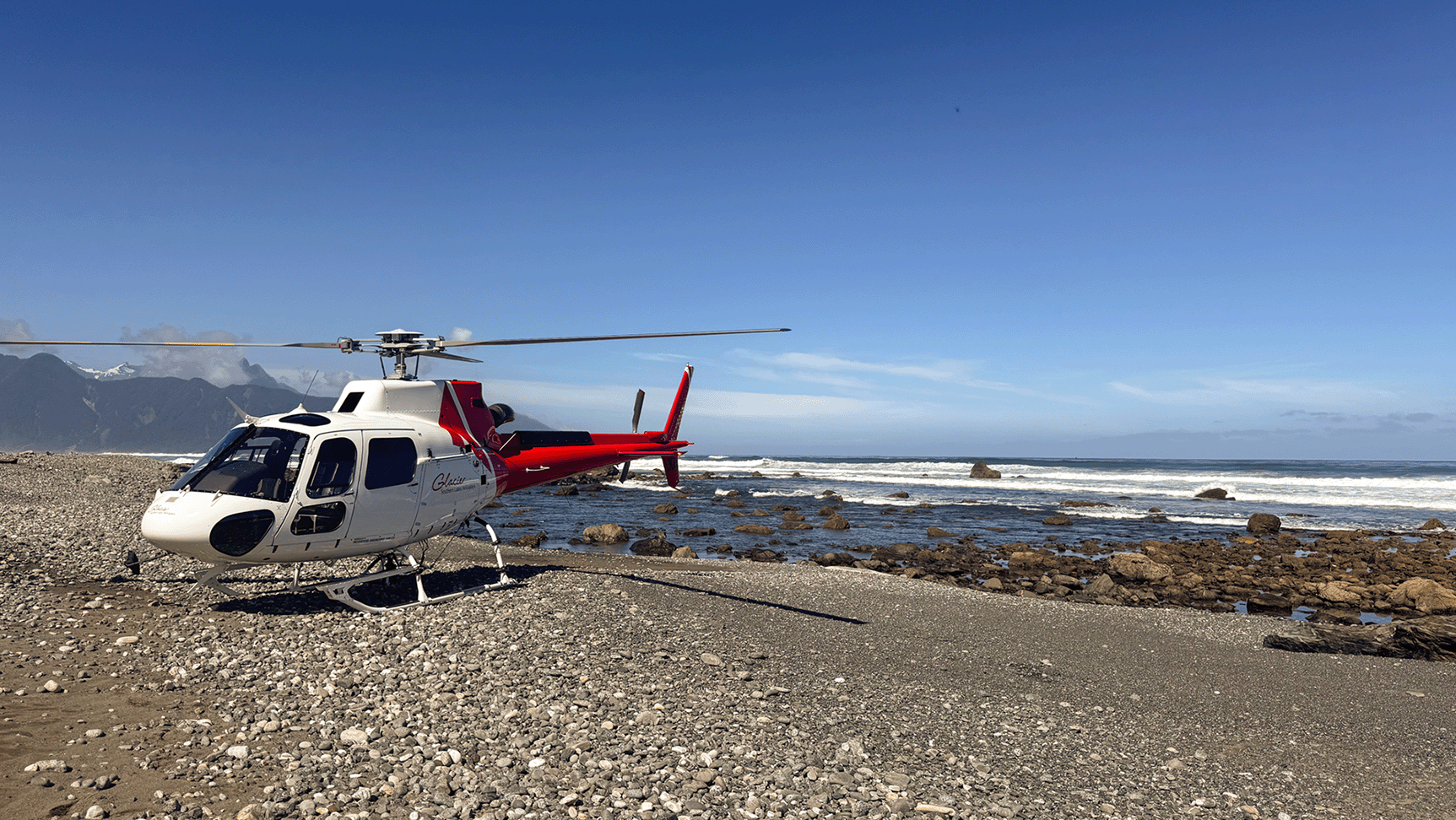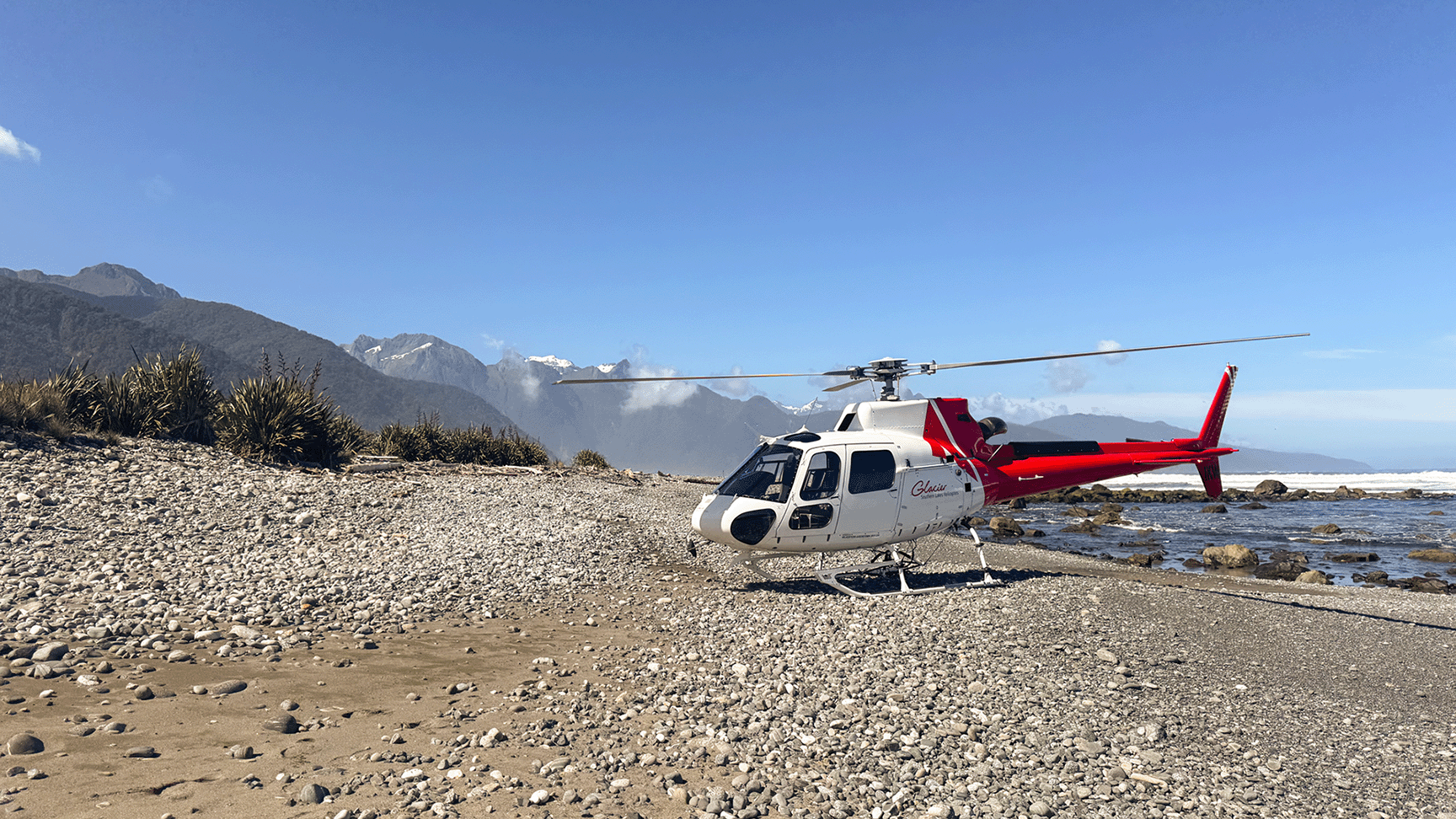 Enjoy a scenic showcase, flying over the Southern Alps to your first landing in Milford Sound for a scenic walk and photo opportunity. Then fly the full 16km length of New Zealand’s most famous fiord taking in the sheer cliffs, cascading waterfalls and imposing mountains of Milford Sound all the way to the West Coast, where the Tasman Sea meets New Zealand. Land on an isolated West Coast beach to experience the truly rugged nature of this untamed region before heading back across the mountains for one last glacier/alpine landing on the way back to Queenstown.
